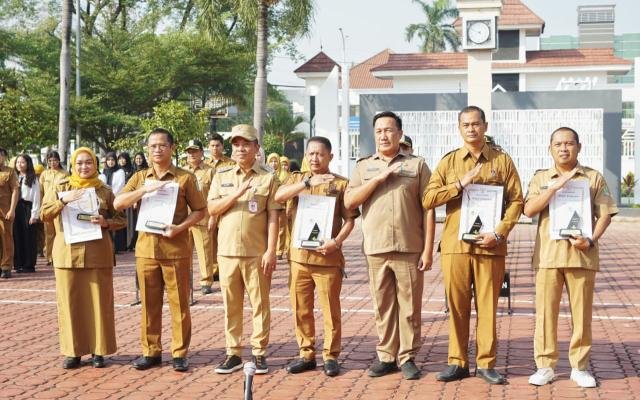 KARAWANG, SUARAPROKLAMASI.COM – Bupati Karawang H. Aep Syaepuloh memimpin apel pagi di lingkungan kantor bupati sekaligus memberikan piagam penghargaan Lomba Desa tingkat Kabupaten (Anugerah Gapura Sri Baduga) yang dilaksanakan di Plaza Pemda, Senin (6/10/25).