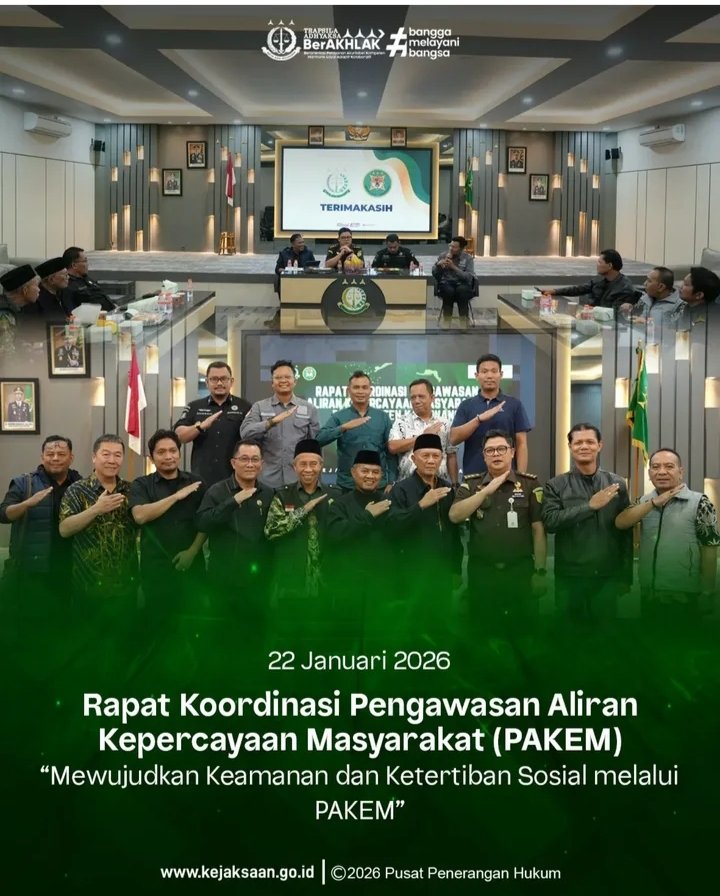 Karawang – Kejaksaan Negeri (Kejari) Karawang menggelar Rapat Koordinasi Pengawasan Aliran Kepercayaan Masyarakat (PAKEM) pada Kamis, 22 Januari 2026. Kegiatan tersebut berlangsung di Kabupaten Karawang dan diikuti oleh unsur Forum Koordinasi Pimpinan Daerah (Forkopimda) serta instansi terkait.
